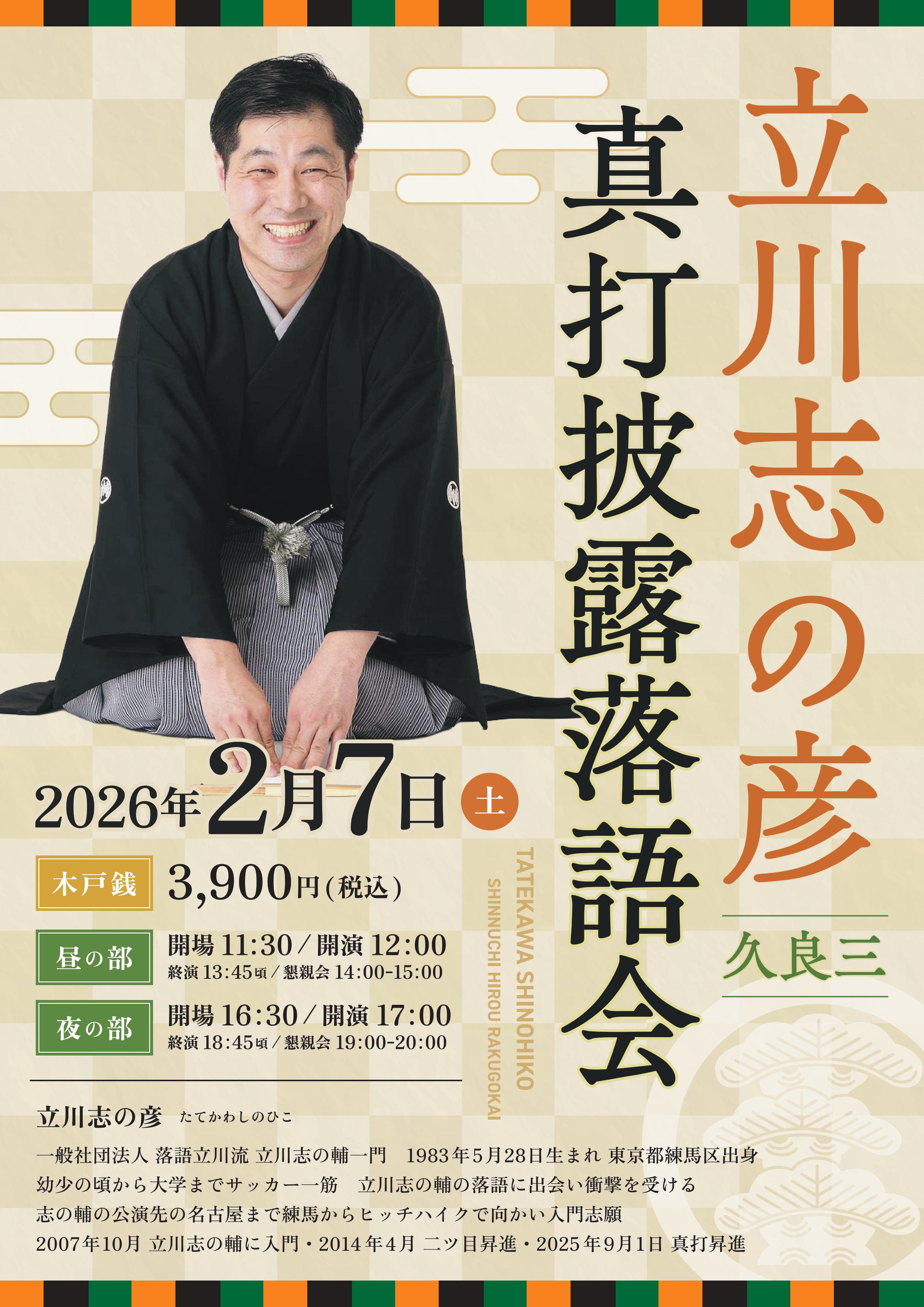 『第五回 立川志の彦の久良三落語会〜真打披露〜』 日時:2月7日(土)昼の部12時開演 夕方の部17時開演 場所:久良三 名古屋