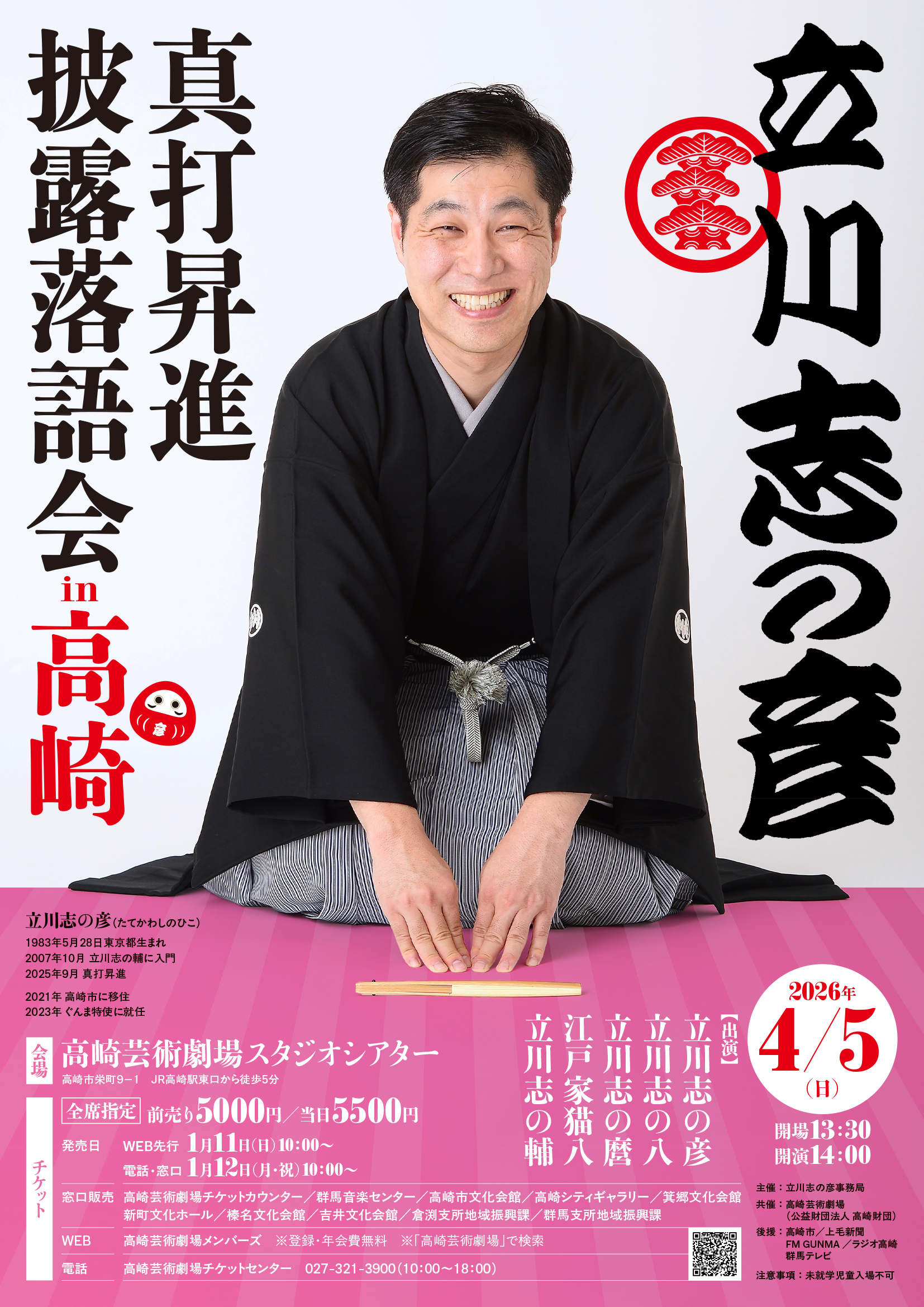 『立川志の彦真打昇進披露落語会 in 高崎』 日時:4月5日(日)14時開演 場所:高崎芸術劇場 スタジオシアター